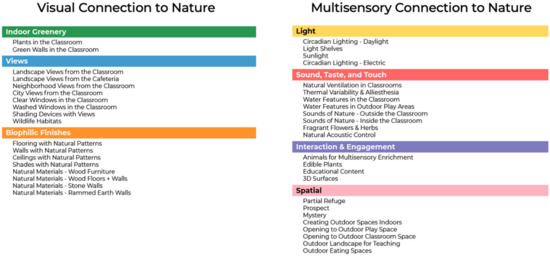 The taxonomy created in this study was strongly influenced by Terrapin Bright Green’s 14 Patterns of Biophilia as well as Stephen Kellert’s 6 Biophilic Design Elements. These strategies were identified to be both significant and feasible in a school setting through a comprehensive literature review. The final taxonomy consists of 42 biophilic retrofit strategies spread across seven categories (Figure 4). The seven categories are grouped into two parts, namely Visual Connection to Nature and Multisensory Connection to Nature. Within Visual Connection to Nature, there are three strategy sets as follows: Indoor Greenery, Views, and Biophilic Finishes. For Multisensory Connection to Nature, there are four factors, namely Natural Light, Nature’s Sound, Taste, and Touch, Nature Interaction and Engagement, and Spatial Biophilic Strategies.