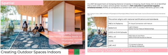 This study was undertaken during the height of the COVID-19 pandemic and necessitated both physical and electronic engagement to increase the number of community stakeholders. Future studies would improve the online interface to enable nuanced location of the cards on the quadrant grid to match the paper version. The paper version of the survey facilitated greater dialogue and exchange, and a greater comparative shuffling of strategies—an altogether deeper level of engagement in the exploration of biophilic retrofits for their school.