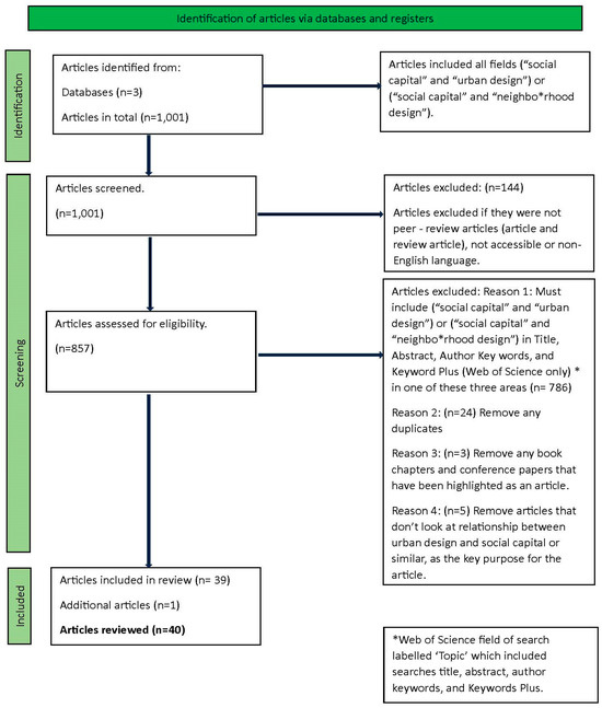 The number of retained papers was still considerable (857 articles); thus, exclusion criteria were then adopted. First, articles needed to have either “urban design” and “social capital” or “neighbo*rhood design” and “social capital” in either the ‘Title, Abstract and/or Keyword search.’ This allowed for screening articles with a strong focus on our research topic. This resulted in 71 articles. These articles were then manually read to screen their relevance and avoid repetition. At this stage, duplicates, non-peer-reviewed articles, and irrelevant peer-reviewed articles were removed (see details in Figure 1). The addition of Pub Med as a database only revealed one additional article after inclusion and exclusion criteria were applied. At last, one extra article was added for this review, as it was referenced across multiple selected articles. Overall, this process revealed a total of 40 articles, which were reviewed for the purpose of this study (Figure 1).