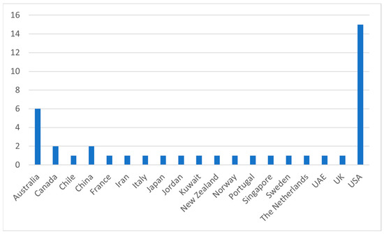 The geographic distribution of researchers’ locations was focused heavily on the United States of America (16), followed by Australia (6), Canada (2), and China (2), while all other 14 countries equalled 1 article each (Figure 3).