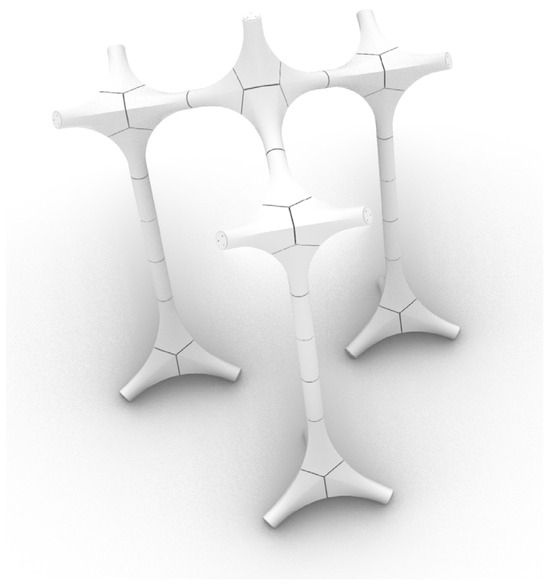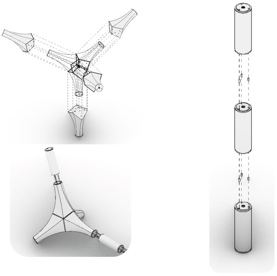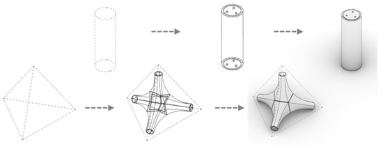 Two types of geometric blocks define the structure’s form, as depicted in Figure 1. New innovative technologies, such as parametric design programs and 3D printing fabrication, are employed to achieve greater morphological freedom, aiming primarily for more efficient use of materials and their properties. The geometry of the pieces is based on the basic shapes of the tetrahedron and the cylinder.