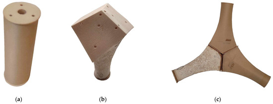The molds created from 3D printing for the two basic geometrical blocks (PLA, Prusa Research); (a) cylinder geometric block; (b) one from the four sub-blocks of the joint geometric block; (c) joint geometric block.