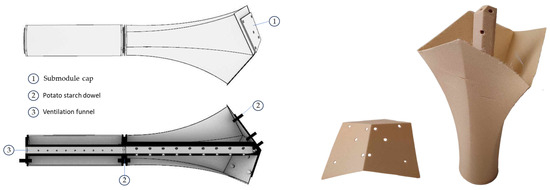 The FFF technique explored in the present paper allows for morphological freedom, making it possible to create complex geometries. The printing filament was created using potato starch, which encourages fungal growth and provides elasticity and support to individual pieces. The surface connection cover played a crucial role in enhancing the distribution of the load across the individual pieces. When combined with the interior conductors, it enabled the seamless connection of each piece to the neighboring pieces, providing a reliable and efficient means of joining the components (Figure 6, number 1). Additionally, the openings in these covers promoted the spread of the mycelium. The different components of the structure were joined using wedges (Figure 6, number 2).