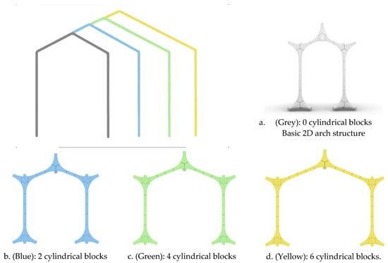 This section aims to propose an arch structural system by exploring various examples of potential assemblies, ranging from simple to more extended structures, using basic modules. The basic 2D arch structure and the modifications needed in order to extend its span are illustrated in Figure 7 (a flowchart of the production of the geometrical blocks and the basic structure). As shown, the arch is assembled by connecting geometric joint blocks with cylindrical blocks. To adjust the dimensions, additional cylindrical blocks can be added, allowing for an increase in the opening and, possibly, the height of the arch.