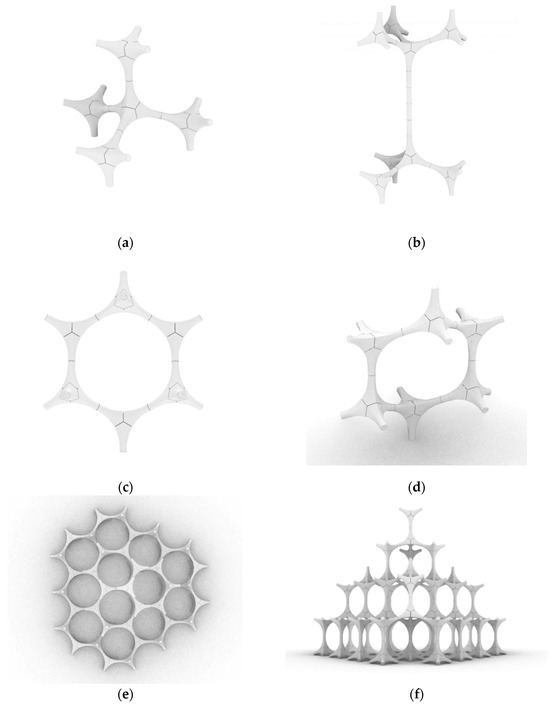 There are many different perspectives on assembling geometric blocks to create various forms and fulfil different purposes. These include decorative objects, furniture, scenery for cultural events, exhibition pavilions, and a wide range of architectural elements or objects, each offering unique design possibilities and functional benefits. Figure 9a,b illustrate assemblies that can serve as bases for objects such as chairs or floor lamps, respectively. Figure 9c,d show an assembly of six joint blocks forming a circular structure. Figure 9e illustrates a combination of cycles, while Figure 9f presents a diamond crystal form structure. Joint blocks are generally used to create curved forms, whereas cylindrical objects are employed as extensions.