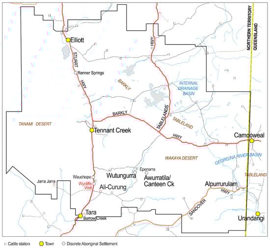The current study focuses specifically on the town of Tennant Creek and the Barkly Tableland in Australia’s Barkly region (Figure 1). Tennant Creek and the Barkly Tableland are in the centre of the Northern Territory in Australia—between 18 and 20 degrees south and from 134 to 138 degrees east and, in climatic terms, are described as dry, with a mild winter and a hot dry summer [13]. Tennant Creek, the largest town in this area, has recorded a warm annual average temperature of 25.5 °C, with winter minimum temperatures typically remaining above 10 °C. In contrast, the period from beginning December through to end March has an average maximum temperature of 36.6 °C, and, as noted above, Tennant Creek experiences an average of 140.5 days above 35 °C and 28.2 days above 40 °C each year. During summer, overnight minimum temperatures average 23.8 °C and provide little relief from the daytime heat [14]. Relative humidity remains low throughout the year, occasionally reaching above 50% in January and February and falling to the 20–30% range over the winter months.