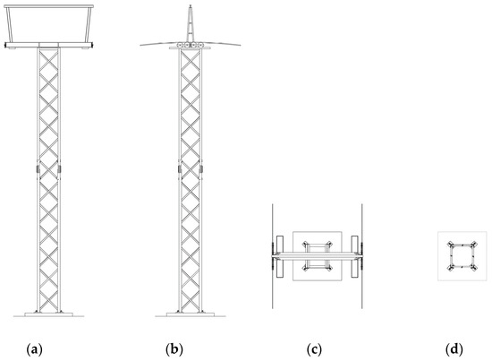 The truss has a square layout, measuring 1.06 m in length and width, and a height of 12.25 m. It is composed of three standardized L-profile elements as shown in Figure 4. The truss consists of two parts connected via six M18 bolts and a top plate on each side of the L-profile. The largest profile, measuring 120 mm × 12 mm × 6620 mm, serves as the corner support and forms the outer profile. It is welded to a baseplate with dimensions of 320 mm × 200 mm × 30 mm, anchoring the structure to its foundation with two M32 bolts, creating a stiff unity. Between each corner profile, 60 mm × 6 mm × 1300 mm profiles are welded on the inside, forming the truss structure. The structure is stiffened by welding the 60 mm × 6 mm profiles diagonally at 45-degree angles, alternating between 45 and −45 degrees. This system is continued on all four sides to create a parallel structure. After reaching 6.16 m in height, the outer profiles transition to a 100 mm × 10 mm × 5600 mm profile, maintaining the same stiffening mechanism and spacing.