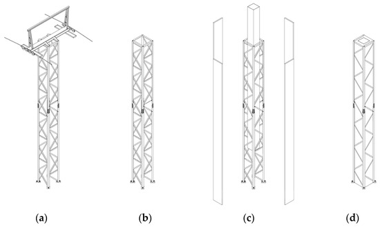 Schematic approach of reworking the ski lift truss to a reused column: (a) an axonometric view of the collected truss, (b) an axonometric view of the collected truss with the seat carrying system removed, (c) an axonometric view of the inserted hollow body in the structure and the placement of the formwork panels, (d) an axonometric view of the finished reused column.
