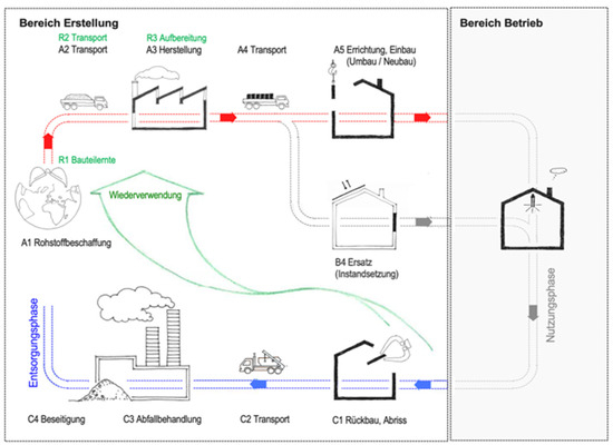 Life cycle according to SIA 2032; 2020 supplemented with reuse [28].