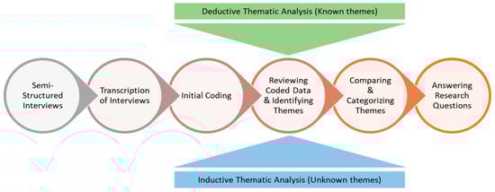 After completing the initial coding, we organized and clustered related codes into broader themes to answer the research questions. Both deductive and inductive thematic analyses were employed for a comprehensive approach [55]. According to [56,57], deductive thematic analysis uses pre-existing theories or frameworks to guide coding and theme development, whereas inductive thematic analysis uses data to determine themes without preconceived categories.