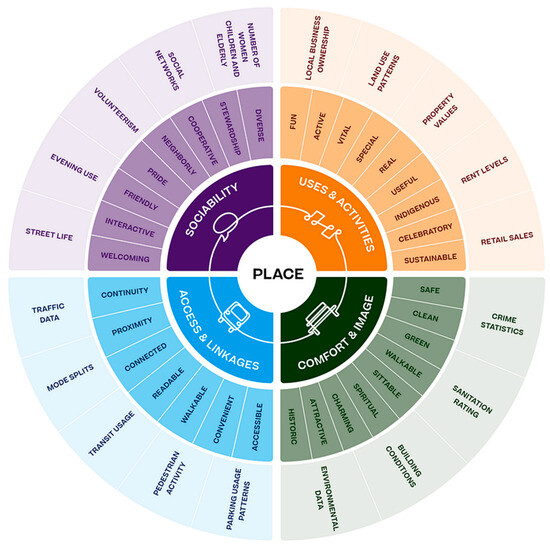 The first aim was to understand participants’ interactions with public places. To achieve this, we employed a deductive thematic analysis to categorize and analyze descriptive codes, based on the placemaking model from the Project for Public Spaces (PPS) [58] (Figure 3). This model was chosen because the main attributes of the model are consistently identified in the literature for evaluating public place qualities [23,24,59]. The PPS model presented three rings, as follows: the inner ring with key place attributes, the middle ring with intangible qualities, and the outer ring with measurable data. We focused on four inner ring attributes as the main themes for deductive analysis. However, we intentionally avoided focusing on the model’s middle and outer rings to extract new sub-themes based on inductive thematic analysis rather than confining our analysis to known categories.