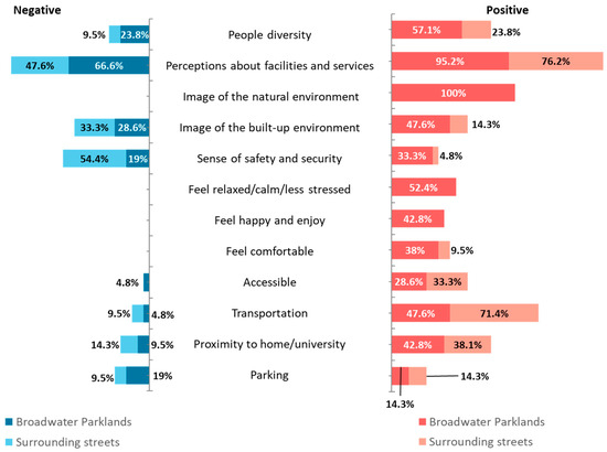 Figure 4 presents the percentage of positive and negative perceptions for themes, highlighting differences between Broadwater Parklands and the surrounding streets. It shows the participants’ sentiments, including favorable experiences and negative feedback. The chart indicates a pattern of mixed satisfaction across different themes, particularly for facilities and services, the built-up environment, and parking areas. For example, facilities and services in Broadwater Parklands received 95.2% positive feedback but also 66.6% negative perceptions; in addition, in the surrounding streets, they had 76.2% positive feedback and 47.6% negative responses. This shows that, while there are positive sentiments, there is still a clear need for improvements. The most significant concern in the surrounding streets is safety and security, with 54.4% of participants expressing negative perceptions and experiences. In Broadwater Parklands, the main concerns are facilities and services, followed by the image of the built environment.