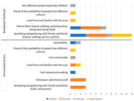 Distinct patterns were identified for each cultural group and their attachment. The Indian participants show a greater attachment to Broadwater Parklands, particularly for socializing and enjoying nature. The Chinese participants have similar reasons for attachment to Broadwater Parklands, but they are particularly attached to the surrounding streets because of Chinatown and other Chinese cultural elements. Iranians demonstrate an equal attachment to both Broadwater Parklands and the surrounding streets, valuing these areas for socializing, nature, comfort, and accessibility. The Australian participants show a strong attachment to Broadwater Parklands, driven by socializing and gathering with friends and families. Familiarity with the area further enhances their attachment to these public places. In particular, some Australian participants are attached to and proud of the study area’s cultural diversity.