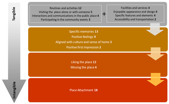 Our results on place attachment as a combination of tangible and intangible factors resonate with the person–process–place (PPP) model [15] and the space-place theory [47]. Although fundamental principles of place attachment are consistent across cultural groups, the specific tangible elements in public places that foster intangible experiences and attachment can vary significantly due to cultural preferences.