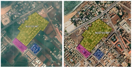 Three case studies are utilized in this study (see Figure 2) guided by specific selection criteria. Firstly, the cases needed to comprise affordable, middle-class, and affluent housing types in a shared location to control for any site-specific variations. Secondly, they also needed to be under the same management structure to mitigate against any potential management differences. Lastly, they needed to have been constructed in a similar timeframe and to have a tenure of approximately two decades. This period of existence is crucial for an exhaustive comparison between the authorized development plans and the existing development, thereby producing a holistic understanding of informal housing trends and dynamics. Given these criteria, the information-oriented approach [62] served as a guide in the selection. Consequently, three residences in Harhoura, Rabat Region, namely Soukhour II, Association Al Firdaous, and Résidence des Médecins, were found to respond to all of these. They present distinct socio-economic and managerial contexts, are geographically interrelated, and represent a contiguous narrative like their configuration of architectural diversity. Officially, they were designated as holiday accommodation areas and bungalows on the initial development plan.
