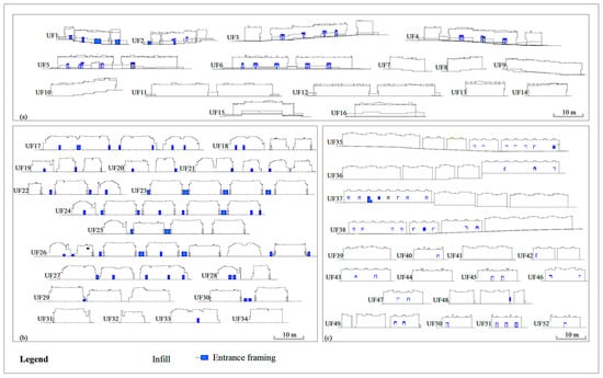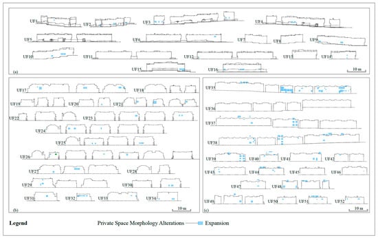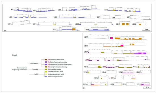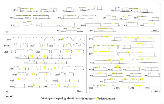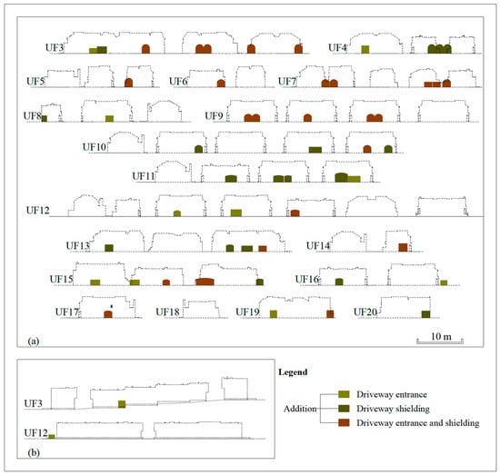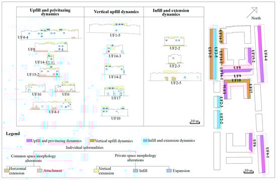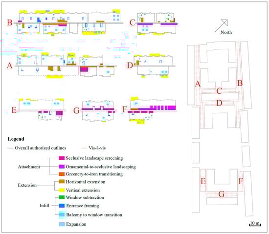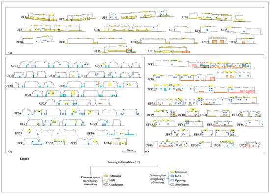 The analysis process starts with a deep comparative study of the authorized drawings submitted to the urban commune and the 2D restitution of real structures. A systematic mapping of housing informalities (HI) is executed by overlaying the submitted facades to the existing built environment. While intended to describe informal housing, we were careful in using the analytical framework by Kamalipour and Dovey [65] to understand housing informalities. We split these informalities into three main groups: extensions, attachments, and infills. For a more systematic grasp, we also classified them into two categories: common and private space alterations. The differentiation emphasizes that the informalities play out in various ways across spatial contexts.