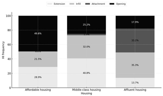 We had to extend Kamalipour and Dovey’s model [65] with “Openings” as a new category, which we were able to identify in our analysis of informalities appearing in private spaces. This was an extension, since the original framework made reference to informal housing as largely pertaining to unauthorized constructions beyond formal regulatory practices. Nonetheless, housing informality (HI) exists as a spectrum between informal practices and homes located within legal zones that can be further disaggregated. It is an important difference as it relates to unauthorized settlements on the one hand (informal housing) and informal adaptations within formalized city structures on the other. As a result, informalities in private spaces fit into the following categories: extensions, infills, attachments, and openings.