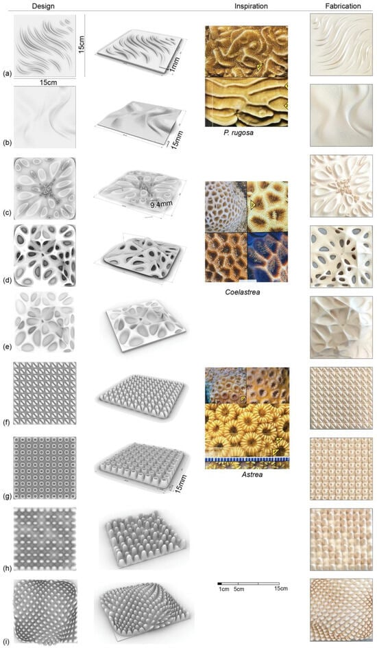 Designs (f, g) are based on Astrea (Figure 1). These are composed of polyp-shaped modular 15 × 15 mm extruded vertically, 1 cm above the surface. These designs create a pattern form inspired by the natural formations of coral polyps. More protected areas for coral larvae attachment. The first creates a series of mountainous formations with deep and tight divisions, whereas the second creates crater shapes that intend to host a coral. Designs (h and i) are variations of the (d) with more irregular formations (Figure 1). The first (h) composes various heights of pointed shapes, giving the surface a less rigid appearance. The last one creates a more dynamic topography that intends to interplay with water flow and sediments.