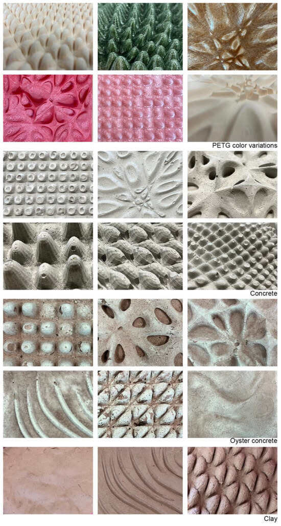 - Additionally, the designs were fabricated as 15 × 15 cm squares using four different materials: thermoplastic PETG, clay, concrete, and oyster concrete. The selection parameters were developed based on the literature review, case study analysis and direct design and fabrication observations.