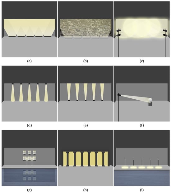 Outdoor lighting techniques. (a) Wall washing, (b) grazing, (c) floodlighting, (d) down lighting, (e) up lighting, (f) accent lighting, (g) mirroring, (h) silhouetting, and (i) spotlighting (Balafoutis, 2015).