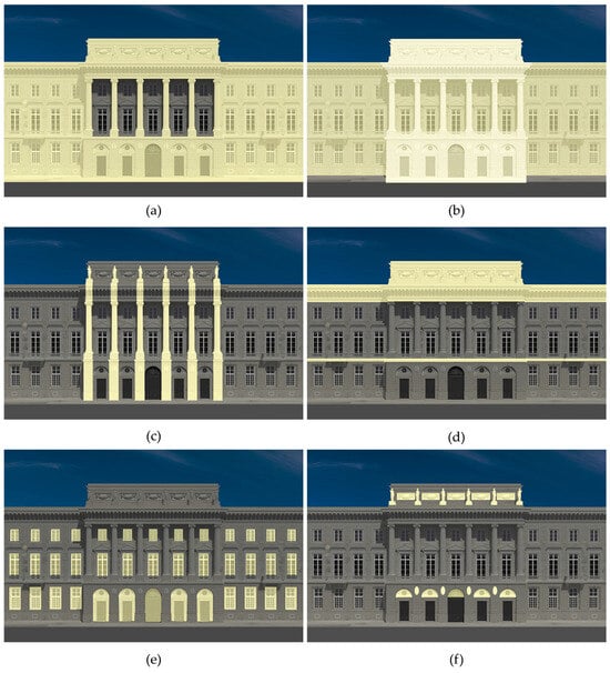 This section presents some basic categories to consider for the lighting to promote historic buildings, so that the lighting effect highlights the historical significance and architectural value of the building. These categories, organized and established by the author, were based on the most common characteristics and the structure of historical buildings (symmetry, repeated structural and decorative elements on the facades, different vertical layers, etc.), so that a designer can find solutions according to the task he is called upon to carry out. It is common in cases of historic buildings that the lighting follows certain guidelines depending on the design of the building. These have to do with the horizontal or vertical character of the decorative elements of the facade, the emphasis of some individual decorative elements or the multiple openings of the facade, and the enhancement of the overall volume by varying the lighting on the different surfaces of the building. In Figure 2, the categories are shown above the 3D-modelled building “Monnaie de Paris”.