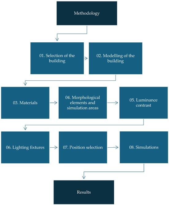 Having analyzed the main parameters needed to achieve a methodology, the implementation of the methodology begins, which is developed in eight (8) steps until the results are obtained. The proposed methodology is based on the common procedure of a lighting study in terms of the steps it proposes, but its development processes, experimentation, findings, and verification or not of the hitherto commonly accepted factors, constituting its own autonomy. The steps of the methodology are as follows in Figure 3: