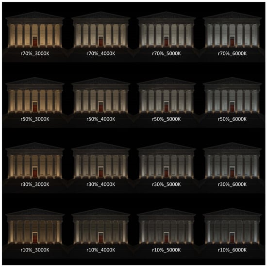 In accordance with the above methodology, in the process of the research conducted by Balafoutis and Zerefos [], a great number of more than five hundred simulated images were rendered, whose characteristics varied according to the factors analyzed. From this research, a database of images was created with information from which interesting conclusions can be drawn from their evaluation (Figure 7 and Figure 8). The evaluation of the results was multifaceted and addressed several topics, such as the aesthetic evaluation of the final visual outcome, lighting performance considerations in terms of technical parameters (e.g., intensity, uniformity, etc.), and light pollution levels produced by each proposed lighting scenario. An important issue in this research are the emotions evoked by the different lighting scenarios on historic features on each observer;therefore, lighting experts were asked to accompany and evaluate the results, as presented below.