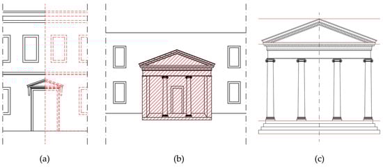 Each facade shall be divided into regions according to the morphological and decorative elements that compose it to analyze them individually and to examine their dynamics in the facade as a whole. In some cases, the area may consist of a single element. The analysis of the facades of this architectural period is framed by various principles common to other architectural styles as well (Figure 5). The principle of classifying elements in rhythmic order when the elements are uniform and create by their presence a unity that has a beginning and an end. The principle of subordination is observed when a unit in a unity has a greater dynamic and dominates. Finally, the principle of the triadic unity is shown diagrammatically by the base, body, and coronation [].