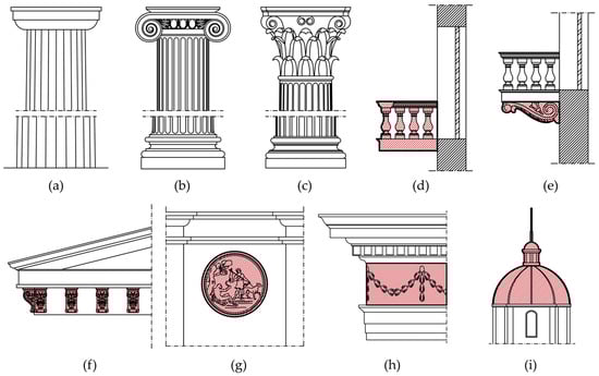 Morphological and decorative elements. (a) Doric order column, (b) Ionic order column, (c) Corinthian order column, (d) balustraded balcony, (e) console, (f) modillions, (g) decorative medallion, (h) garland, and (i) dome with cupola (or lantern) (Balafoutis, 2020).