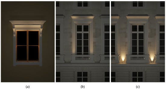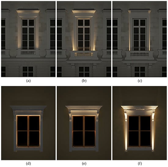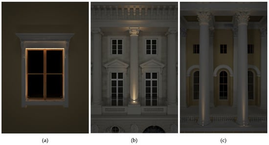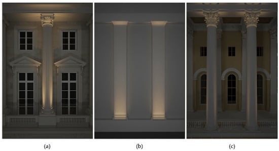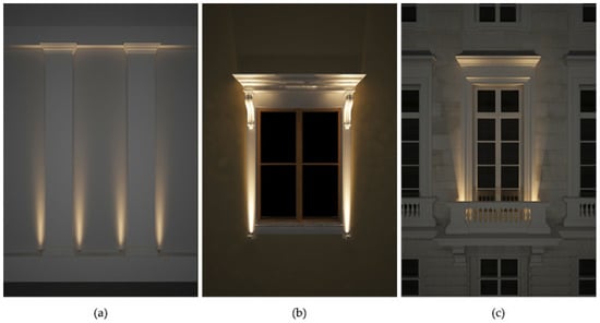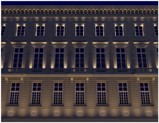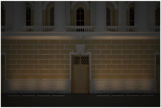 For the lighting of the base, since the evaluation did not reveal any noticeable effect, a linear luminaire (Flood Angle 32°, 3000 Κ, 2163 lm) was used, and the position of the luminaires, as shown in Figure 14, was considered a neutral effect by the experts and common in the market. For the illumination of the coronation, the same luminaire was used as the base, so that in the result there is a uniformity at the two boundaries of the facade (top and bottom), to focus the observation on the piano Nobile and to show the variation of the illumination from image to image.