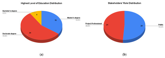 Figure 4b). The public external stakeholders involved non-governmental organizations, civil society and community, media, academia, and the environment. On the other hand, the project professionals were a sub-stakeholder group under the internal stakeholders, which involved bank and financial institutions, project managers, designers, architects, engineers, facility managers, contractors, subcontractors, construction companies, real estate agencies, demolition and deconstruction companies, and waste treatment companies. Per the highest education level distribution, this questionnaire captures that most public stakeholders had an academic background, reflecting the specific stakeholder type of academia focusing on sustainability and the circular economy. This, in turn, brings the academia’s both theoretical and practical perspectives to the questionnaire’s results. On the other hand, the project professionals’ involvement brings a detailed practical perspective. Even though the questionnaire also aimed to reach the other internal stakeholders, encompassing owners, users/consumers, suppliers, manufacturers, and governmental external stakeholders, no responses have been received. There is a notable gap in the results of this questionnaire.