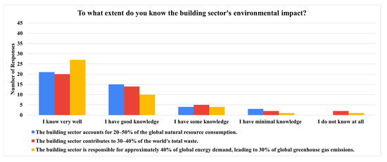 Figure 5), “To what extent do you know the building sectors’ environmental impact?” indicated the stakeholders’ high level of knowledge and awareness about the building sector’s environmental impact, specifically for the natural resource demand and consumption and greenhouse gas emissions, while notably for waste production, their knowledge and awareness are less comprehensive [