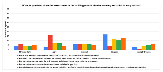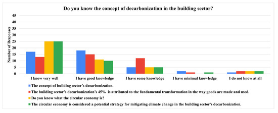 Figure 6), “Do you know the concept of decarbonization in the building sector?” indicated that the stakeholders are very well informed about the circular economy concept as a decarbonization strategy for the reduction in the building sector’s environmental impacts while underscoring a considerably moderate level of understanding about some educational programs to be targeted that could further enhance understanding, especially on the impact of decarbonization on goods production and usage [