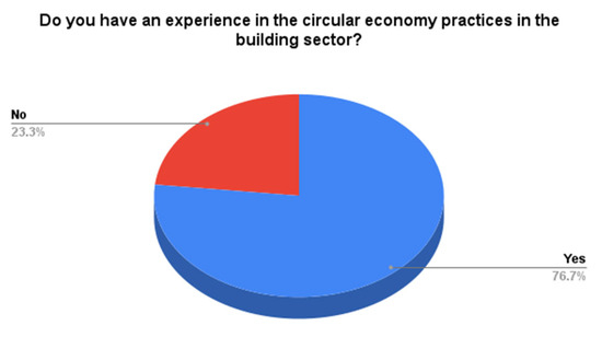 Figure 7), “Do you have experience in the circular economy practices in the building sector?” indicated the stakeholders’ high engagement and familiarity with the circular economy practices while showcasing a rich pool of experience to be leveraged to advance circular economy initiatives into practice by providing valuable insights and feedback on what works and what does not, helping to refine and improve the circular economy implementation in the building sector. Thus, only 33 participants, as the real circular economy practitioners, succeeded in the following parts of the questionnaire, while the questionnaire was terminated for the remaining 10 participants. Therefore, the results highlighted that despite strong existing engagement, there is still room for growth, showcasing the importance of education and the involvement of real practitioners to broaden the base, enhancing the overall effective implementation of the circular economy in the building sector [