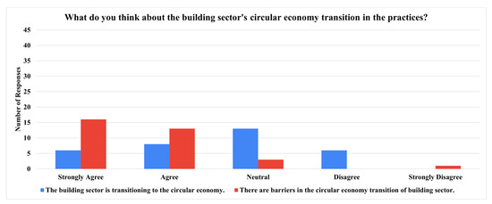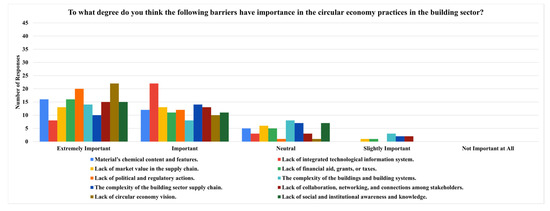 Figure 9), “To what degree do you think the following barriers have importance in the circular economy practices in the building sector?” indicated the stakeholders’ ideas based on their experiences about the barriers to the circular economy transition in the building sector. The results stated that the political and regulatory barriers are the most important barriers blocking effective implementation, while the lack of circular vision as a social barrier is equally important. Thus, while echoing [