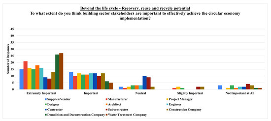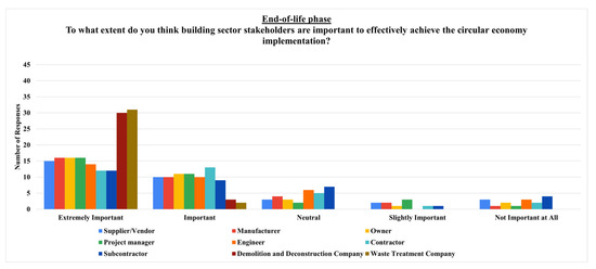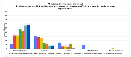 The question, “To what extent do you think building sector stakeholders are important to effectively achieve the circular economy implementation?” has been addressed firstly for all the building life cycle phases and beyond, encompassing only external stakeholders due to their indirect involvement in the whole building life cycle phases. Following this, the question has been directed to each building life cycle phase, from the production phase to the end-of-life phase and beyond the building life cycle.