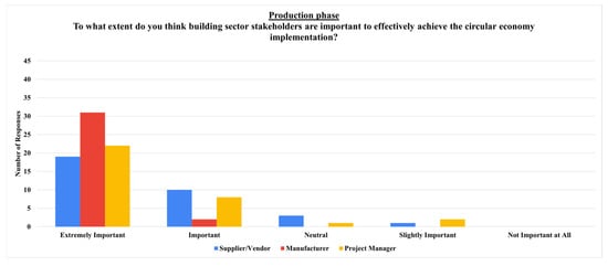Figure 12) indicated that manufacturers overwhelmingly seem to be the most important internal stakeholders in the production phase, stating their crucial role in building materials and components adhering to the circular economy. The project managers are also considered highly important in the production phase but are still less important than manufacturers. Their decision-making process in overseeing and coordinating the operations, processes, and the other stakeholders in the production phase is essential. However, their critical importance could vary depending on the project or the effectiveness of the individual project manager. Finally, even though suppliers/vendors are seen to be less important compared to the others, their role in providing materials and products that meet the circular economy is critical. However, their critical importance could depend on their commitment to the circular economy initiatives and practices, product quality, and physical and chemical content. Therefore, these internal stakeholders’ decision-making processes could be significantly influential, ensuring comprehensive communication and collaboration across the production phase to achieve a more effective transition toward the circular economy in the building sector.