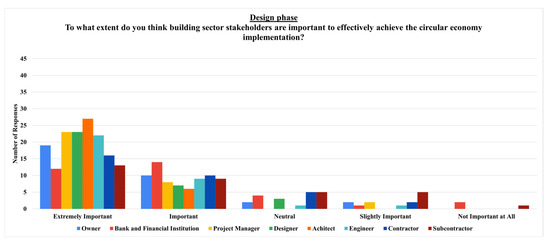 17]. Therefore, the results obtained for the last part of the questionnaire could not be directly compared with those of these research studies since they did not directly seek to determine the importance of stakeholders across the building life cycle. Thus, this methodological approach offered a novel contribution to understand and evaluate their importance in advancing the circular economy, providing a new perspective on its transition in the building sector.