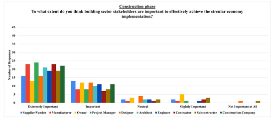 Figure 14) indicated that construction companies are considered the most important internal stakeholders thanks to their role in executing building projects and ensuring adherence to the circular economy. Project managers’ crucial importance is thanks to their role in coordinating processes and operations and ensuring the circular economy is embedded in the construction phase. Manufacturer’s role is crucial in making the building materials and components in line with the circular economy in the construction phase. Architects have a pivotal role in the construction phase while ensuring that their circular building design is accurately executed, thus translating the design initiatives into practices, such as circular buildings. Contractors’ importance is displayed through their role in being responsible for the day-to-day execution of processes and operations in line with the circular economy in the construction phase. Engineers provide the technical expertise to implement the circular economy in construction. Suppliers/vendors’ vital importance is demonstrated through their role in proving materials and products in the construction phase, stating their significance in responsible material selection and natural resources. Designers must ensure that the original design intent, including the circular economy initiatives, is executed in practice during the construction phase. Subcontractors are important in executing specific tasks within the construction phase’s operations and processes. Finally, owners’ importance is displayed through their role and commitment to drive the adoption of the circular economy initiatives and practices, arguing that their impact can be inconsistent, possibly depending on their level of involvement and understanding of the circular economy issues. Therefore, these internal stakeholders’ decision-making processes could be significantly influential, ensuring comprehensive communication and collaboration across the construction phase to achieve a more effective transition toward the circular economy in the building sector.