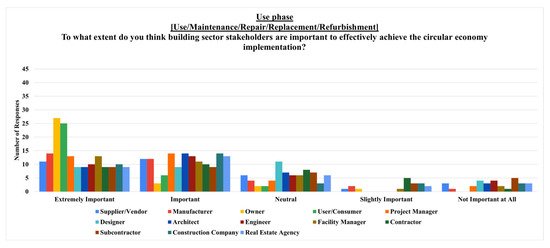 Figure 15) indicated that the users/consumers are considered the most critically important stakeholders in the use phase. Their actions and behaviors, thus the decision-making process, motivate the circular economy implementation in the use phase processes and operations, stating their significant role. Owners’ vital role in their decision-making process is to be responsible for the building’s maintenance, repair, renovation, refurbishment, or use while ensuring the building remains aligned with the circular economy. Project managers’ importance is demonstrated through their role in overseeing the operational efficiency, as well as the sustainability and the circularity of the buildings in repair, renovation, and refurbishment stages, indicating their dependence on the specific context and their level of involvement in the use phase. Manufacturers’ role is important in providing innovative, sustainable, circular, specifically durable materials, products, and components to prolong the building’s functional lifetime in the use phase’ repair, renovation, and refurbishment stages. Facility manager’s role is important in the day-to-day operation and maintenance of buildings while ensuring that circular economy practices are implemented in the use phase. Construction companies’ role is crucial in providing ongoing technical support aligned with the circular economy in the use phase’s repair, renovation, and refurbishment stages. Suppliers’/vendors’ critical role is to provide replacement materials, products, and components in the use phase’s repair, renovation, and refurbishment stages while ensuring availability and circularity. Engineers play a crucially important role in ongoing maintenance and addressing any technical issues that arise during the use phase’s maintenance, repair, renovation, and refurbishment stages while having their vital expertise for the circularity performance of the building. Architects ensure that circular design integrity is maintained in the use phase’s maintenance, repair, renovation, and refurbishment stages, while their involvement is particularly important for aesthetic and functional upgrades. Real estate agencies play a crucial role in leasing and selling properties, influencing user/consumer engagement and property value in the use phase while promoting buildings that adhere to circular economy practices and initiatives. Contractors are important in maintaining, repairing, renovating, and refurbishing the buildings in the use phase while having less critical importance than the other stakeholders involved. Designers’ role is essential in contributing to the aesthetic and functional modifications in the use phase, while their ongoing role is not as essential as that of the other stakeholders. Subcontractors’ role is important in providing specialized services for the use phase’s maintenance, repair, renovation, and refurbishment stages while having less critical importance than the other stakeholders involved. Therefore, these internal stakeholders’ decision-making processes could be significantly influential, ensuring comprehensive communication and collaboration across the use phase to achieve a more effective transition toward the circular economy in the building sector.
