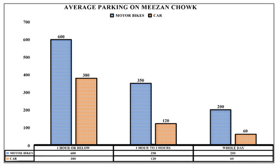 Parking data at Meezan Chowk, collected through one week of systematic vehicle counts at fixed times, reveals a high turnover of short-term parking (see Figure 3). An average of 600 motorbikes and 380 cars were recorded within one hour. This number decreases to 350 motorbikes and 120 cars for 1–3 h stays and further drops to 200 motorbikes and 60 cars for all-day parking. These figures highlight the area’s busy commercial activity and constant traffic flow, emphasizing its role as a dynamic urban hub.