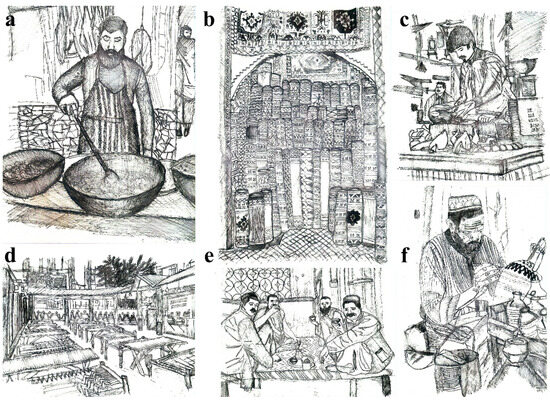 Sketches (a) fried food seller, (b) carpet shop, (c) butcher shop, (d) cafe, (e) tea house, and (f) pottery store.