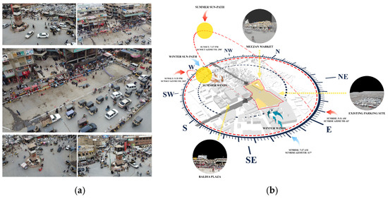 The total site area is 123,738 square feet and includes several distinct zones that require thoughtful redesign and improvement. The parking lot, which covers 44,000 square feet, is currently underused; it generates no income and lacks environmental sustainability. Meezan Market, occupying 17,000 square feet, functions mainly as a local market serving traditional vendors. Adjacent to this is a 10,000-square-foot area where informal vendors have set up unregulated stalls, leading to disorganized conditions that require proper planning and regulation. The vegetable market spans 10,500 square feet, is in a poor and deteriorated state, and demands significant renovation. Additionally, Meezan Chowk and the surrounding road area comprise 42,238 square feet and hold historical significance, contributing to the site’s cultural and urban identity (see Table 4 and Figure 7b).