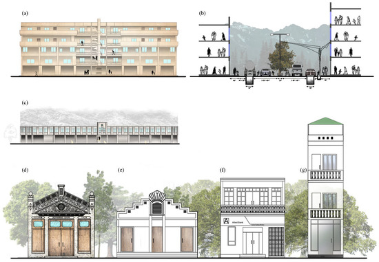 Elevation of (a) Baldia Plaza, (b) Road section, and (c) Meezan market. (d) Muhammad Qasim building (1938), (e) shoe shop (1890), (f) Allied Bank (1941), and (g) Sherbaz and Brothers fashion agency store (1953) location: heritage sites at Meezan Chowk, Quetta.