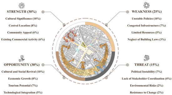 This research uses a qualitative, comparative case study approach, applying SWOT analysis as a planning framework to develop a culture-led urban regeneration design for Meezan Chowk (see Figure 2). Additionally, combining primary and secondary data sources informed the SWOT analysis. Primary data were collected through observation surveys, questionnaires, and focus group discussions with diverse stakeholders, including residents, street vendors, and community members. Secondary data comprised urban regeneration reports, urban morphology and planning documents, scholarly articles, and historical archives. Additionally, to support this, site data was obtained from Geographic Information Systems (GIS) and OpenStreetMap data was used to examine the site’s spatial dynamics and urban morphology, following Oliveira and Pinho (2009) [18]. Additionally, as demonstrated in the previous studies on the evaluation of heritage sites [19,20], this study also applies the SWOT analysis framework to analyze the urban regeneration potential of Meezan Chowk. Following data collection, a qualitative thematic analysis was conducted to identify recurring patterns and site-specific issues. These findings were then categorized into internal factors (strengths and weaknesses) and external factors (opportunities and threats), as illustrated in the SWOT matrix.