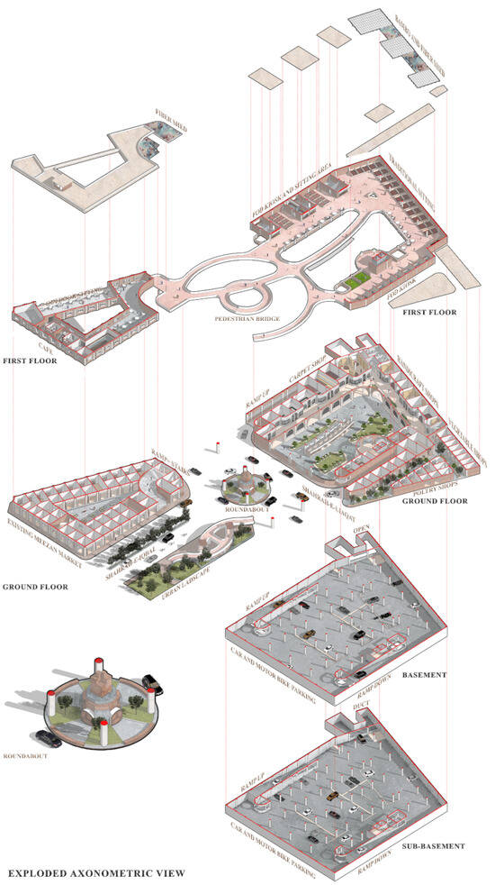 However, despite this challenge, the study offers a comprehensive, culturally grounded, and practically implementable design proposal for the regeneration of Meezan Chowk, Quetta. Using a qualitative methodology that combines structured surveys, focus group discussions, site sketches, GIS mapping, and SWOT analysis, the research identifies both the potential and vulnerabilities of the site. The design integrates modern infrastructure, such as two-level basement parking, food courts, and organized marketplaces, with vernacular architectural elements like arched facades, courtyards, shaded verandahs, and traditional tea and craft shops. This hybrid approach enhances livability, sustains local culture, and improves spatial accessibility, responding directly to user needs, traffic congestion, and informal economic structures.