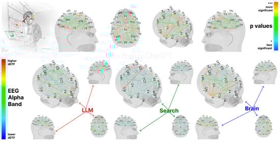 The dynamic Direct Transfer Function (dDTF) EEG analysis of Alpha Band for groups: Search Engine, Brain-only, LLM, with p-values to demonstrate significance from moderately significant (*) to highly significant (***) [10].