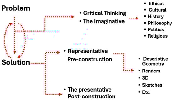 The cognitive process underpinning architectural creativity can be visualized as a problem-solution dynamic involving continuous iteration between conceptualization and representation (Figure 2). This framework begins not with form but with intellectual engagement—with the ethical, cultural, historical, and philosophical dimensions of the problem. Through critical thinking and imagination, the architect draws upon tacit knowledge to shape the conceptual phase. Although depicted simplistically, this process is nonlinear and complex, involving simultaneous engagement with philosophical, cultural, historical, and technical knowledge, culminating in a creative architectural solution. Once this mental conceptualization occurs, it is externalized through representational techniques such as descriptive geometry, CAD software, and visualization tools.