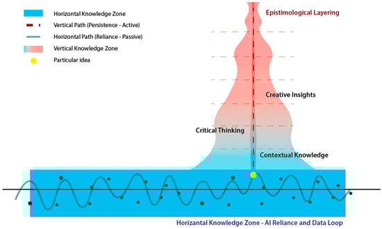 In contrast, vertical epistemological growth necessitates the active and critical intervention of architects. This active stance involves consciously breaking free from data-driven cycles through reflective and creative processes, a practice referred to here as “epistemological layering.” Epistemological layering is the deliberate process through which architects integrate multiple levels of knowledge, historical, cultural, contextual, technological, philosophical, etc., to produce innovative solutions. Rather than relying solely on AI-generated outputs, architects who engage in epistemological layering critically interrogate, transform, and transcend these outputs, deepening architectural understanding through each successive iteration. This conceptual framework is visualized in Figure 4, which presents the dynamic oscillation between horizontal and vertical knowledge expansion as a fluid epistemological continuum. To further situate this model within a dialectical matrix, a complementary quadrant diagram (Figure 5) is introduced. The quadrant diagram categorizes the epistemic conditions of architectural design across varying levels of agency and creativity. While Figure 4 emphasizes the temporality and internal rhythm of knowledge deepening, Figure 5 enables critical positioning and argumentative clarity by mapping the epistemic consequences of AI–human interaction across four quadrants. The dual inclusion of these diagrams reflects the necessity of both ontogenetic flow and topological distinction in the analysis of AI’s impact on architectural knowledge.