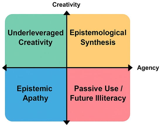 Epistemological Conditions of AI-Driven Design: A quadrant model mapping the intersection of creativity and agency. The horizontal axis represents the degree of agency (from low to high), while the vertical axis represents creativity (from low to high). Source: Author (2025).